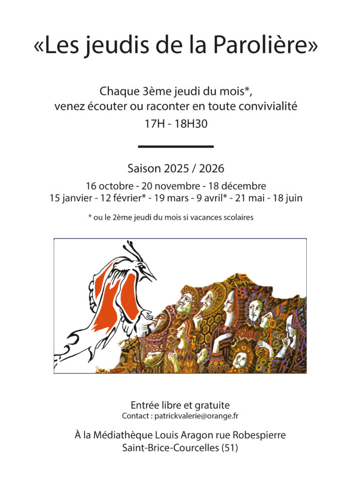 Le rendez-vous mensuel qui fait la part belle au conte, proposé par l’Association La Parolière. Tous les 3ème jeudis du mois de 17h à 18h30 (ou 2ème jeudi si vacances scolaires) à la Médiathèque.