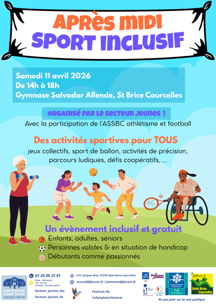 Le secteur jeunes en association avec le club d’athlétisme et de football vous invite à une après-midi sport inclusif au Gymnase Salvador Allende de Saint Brice Courcelles.