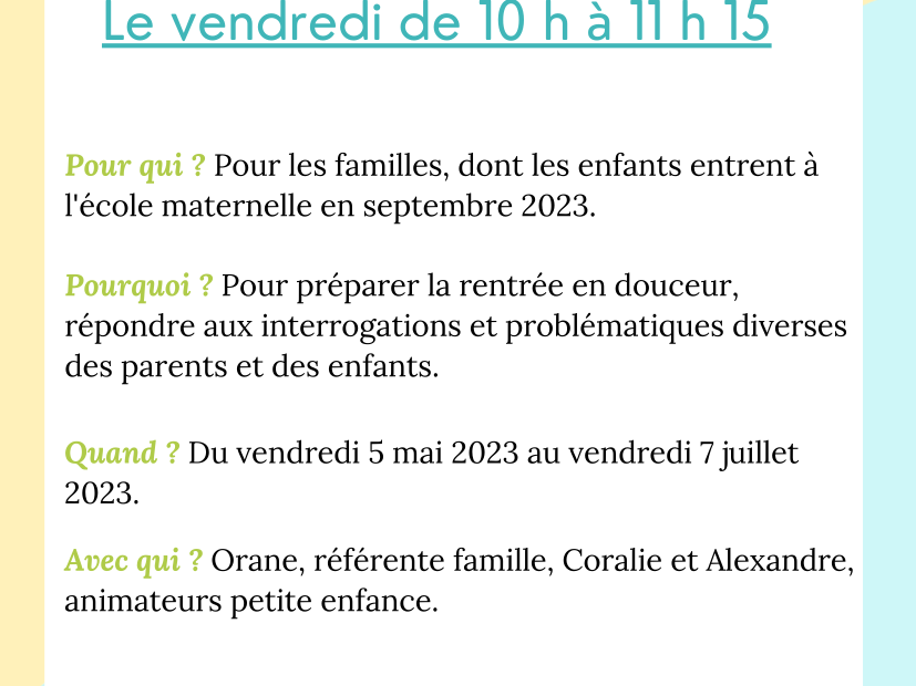 Au centre social, la référente famille et deux animateurs vous proposent des ateliers de préparation à l’école maternelle.