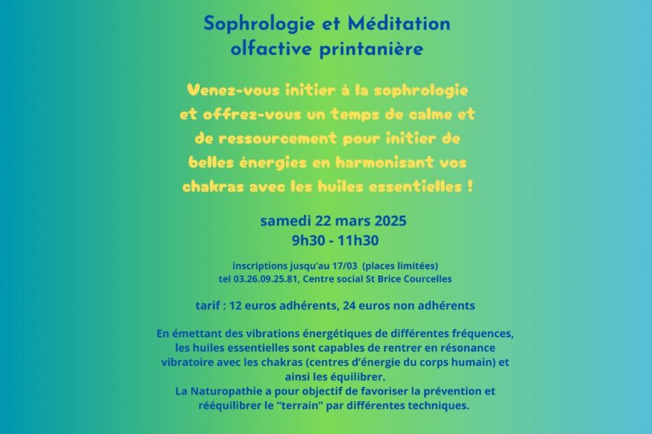 La section Sophrologie vous propose un atelier sophrologie et méditation olfactive printanière le samedi 22 mars 2025.Atelier Sophrologie