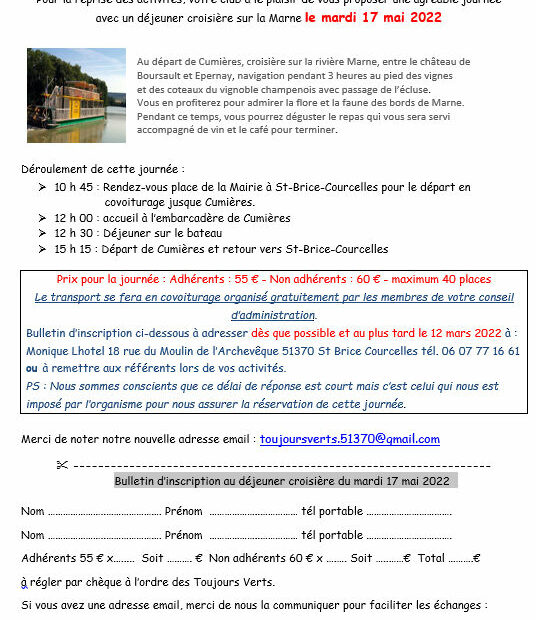 L’association des Toujours Verts propose une journée sympathique pour un déjeuner en croisière sur la Marne.Journée Déjeuner Croisière sur la Marne