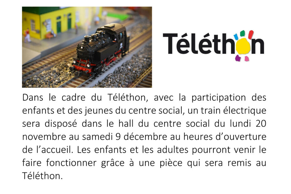 Dans le cadre du Téléthon, le centre social s’est mobilisé pour assurer une animation : M. Kleinau, adhérent au centre social, nous a prêté un très beau train électrique, L’Atelier Bois nous a aidé à construire une structure, L’Association SBC… Téléthon, venez tester notre train électrique…
