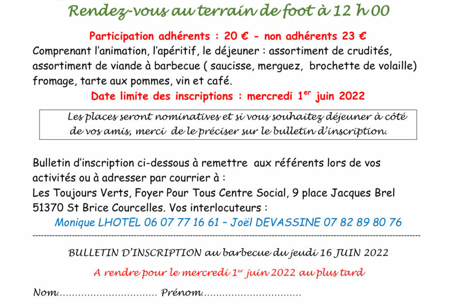 L’association des Toujours Verts vous proposent de vous joindre à leur barbecue annuel.Barbecue des Toujours Verts